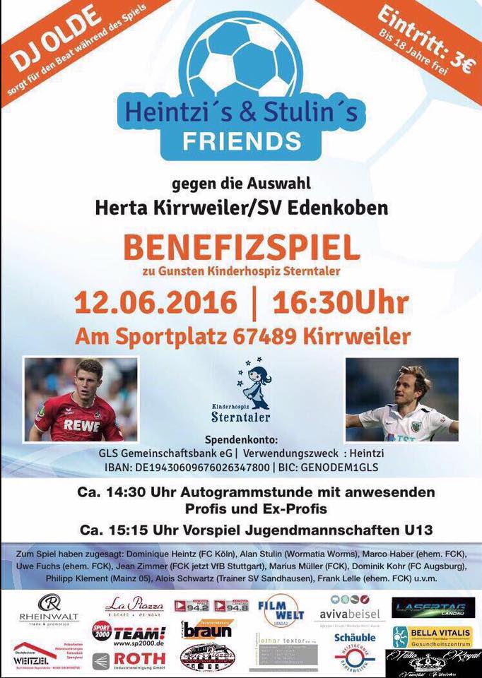 Am Sonntag, 12. Juni, steigt um 16.30 Uhr in Kirrweiler ein Benefizspiel für das Dudenhofener Kinderhospiz Sterntaler. "Heintzis und Stulins Friends" treten gegen eine Auswahl von Herta Kirrweiler/SV Edenkoben an. Dominique Heintz (1. FC Köln) und Alan Stulin (VfR Wormatia 08 Worms), sowie der Landauer Werner Zimmel organisieren die Partie samt Rahmenprogramm mit Autogrammstunde. Unter anderem zugesagt haben Marius Müller, Jean Zimmer, Marco Haber, Philipp Klement uvm.