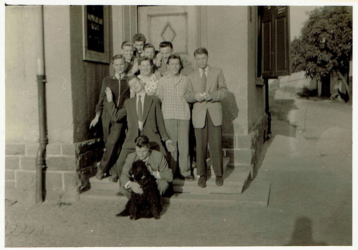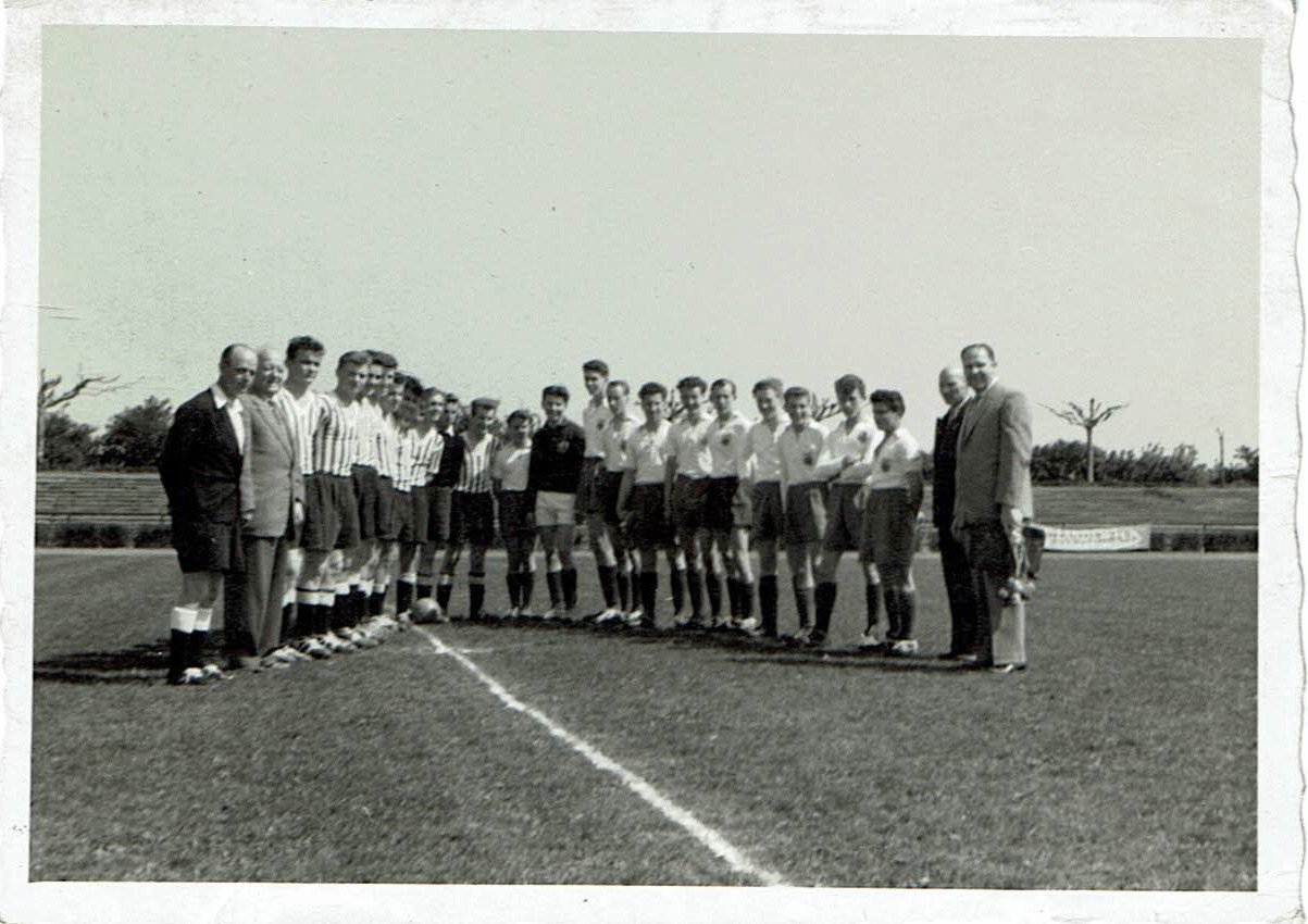 rechte Seite von links: Heinz Weick, Jürgen Theis, Hans Dörr, Deibert, Manfred Wennesheimer, ?, Bernd Jeck, ?, ?, Bruno Biontino (?), Willi Löb, Betreuer Ernst Klein, Hans Theis.