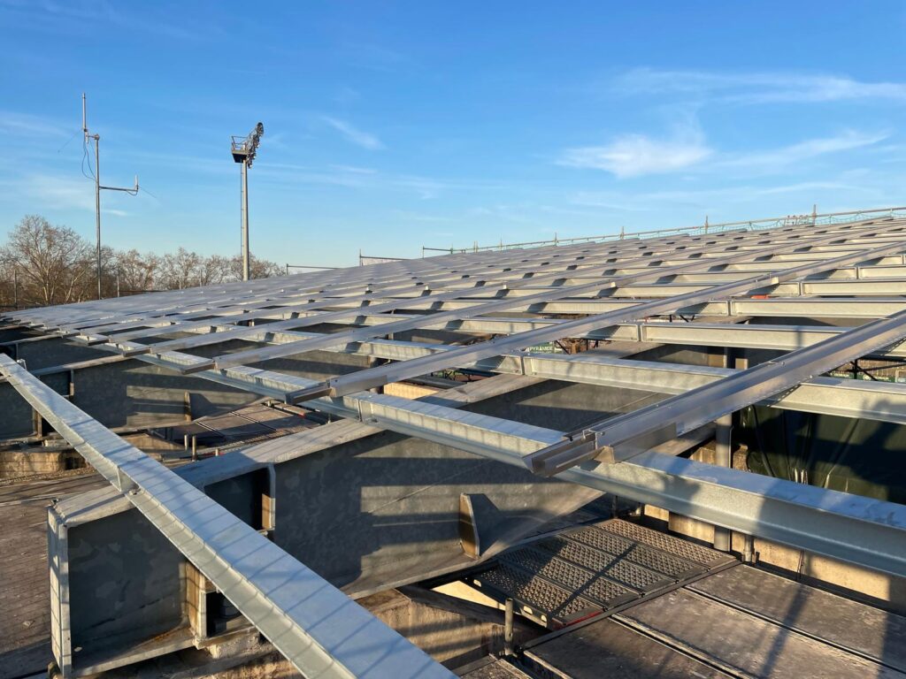 ✔️ Taubenschutz – Parallel dazu werden die Stahlträger mit einem speziellen Taubenschutz versehen, um langfristig für Sauberkeit unter dem Tribünendach zu sorgen.