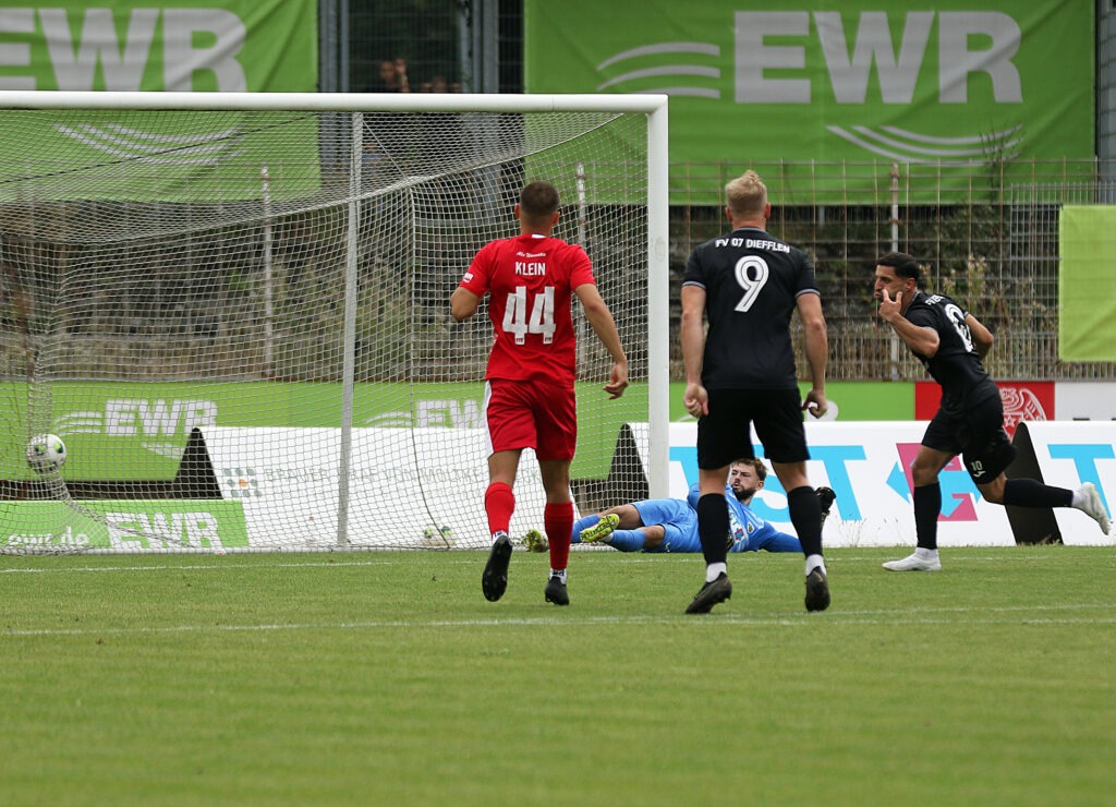 Das Spiel begann turbulent und Mert Özkaya hatte nach 45 Sekunden das 1:0 auf dem Fuß. Sein Flachschuss auf Ablage von Nico Jäger aus sieben Metern war jedoch zu zentral. Weitere Möglichkeiten hatte danach erst einmal nur der FV Diefflen. Bei den Schüssen von Haase (6., 18.) zeigte Torwart Tobias Edinger Unsicherheiten, Theisinger (13.) und Kern (20.) verfehlten das Tor nur knapp und besonders eng war ein Zufallsprodukt beim ersten Eckball der Gäste (6.). „Wir hatten in der 1. Halbzeit eine viel zu niedrige Zweikampfquote“, ärgerte sich Ddaou.