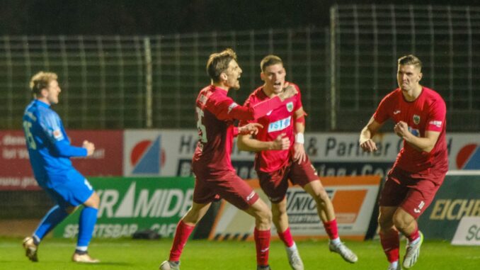 Danach ging es weiter nach vorne, immer wieder konnten die Wormaten sich Bälle erobern und weitere vielversprechende Angriffe starten, denen aber die Präzision fehlte. Dass dennoch das gegen Engers vermisste Spielglück zurück war, zeigte der erste gefährliche Gästeangriff: Ciolaks Hereingabe schaufelte El Mahaoui im Fallen aus fünf Metern drüber (24.). Spielglück hinten und vorne, denn nach langem Ball von Simon Ludwig gab es den nächsten Elfmeterpfiff. Engler traf Fesser an der Ferse – nach Ansicht der Zeitlupe wohl knapp außerhalb des Strafraums. Schiri Hasmann zögerte auch ein paar Sekunden und zeigte dann doch auf den Punkt. Diesmal schickte Jannik Marx Torwart Simon in die falsche Ecke (30.).