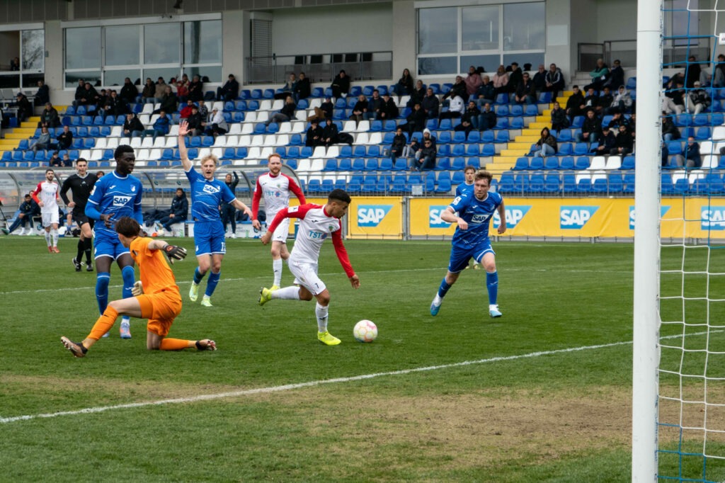 Im direkten Gegenzug kamen die Wormaten vorne plötzlich doch mal durch im Strafraum und Nicola Arcanjo Köhler traf zum schon bejubelten 0:1 – doch Abseits (29.). Nach Ansicht der Videobilder womöglich eine Fehlentscheidung. Drei Minuten später war Damar schließlich erfolgreich. Sein Freistoß knallte zunächst an die Latte, der Ball blieb noch heiß und Damar traf unhaltbar zur Führung für Hoffenheim (32.). Nils Fischer bot sich noch die Gelegenheit zum Ausgleich, aus spitzem Winkel flog sein Flachschuss am langen Pfosten vorbei (45.+2).
