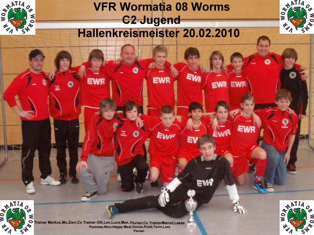 Am Samstag, 20. Februar 2010, wurde die Endrunde der Hallenkreismeisterschaft der C-Junioren ausgetragen. Unsere C2 traf dort auf die TSG Pfeddersheim 1, TSG Pfeddersheim 2, SG Guntersblum, SV Horchheim, SG Guntersblum und VfL Gundersheim. Im ersten Spiel hatten es unsere Jungs mit dem Rivalen aus Horchheim zu tun. Nach anfänglichen Schwierigkeiten endete die Partie mit einem gerechtem 3:3. Im zweiten Spiel hieß der Gegner SG Guntersblum und hier konnten sich die Wormaten nach starker kämpferischer Leistung mit 3:2 durchsetzen. Danach traf man zunächst auf die TSG Pfeddersheim 2, die man verdient mit 3:1 schlagen konnte. Anschließend spielten unsere Jungs gegen die TSG Pfeddersheim 1, die sogar mit 6:0 vom Platz gefegt wurde. Dann kam es in der letzten Partie, gegen den VfL Gundersheim, zu einem echten Endspiel. Der VfL Gundersheim war bis zu diesem Spiel ungeschlagen und unsere Jungs lagen auf dem zweiten Platz, also ging es in dieser Partie um die Hallenkreismeisterschaft. In einem sehr hart umkämpften Spiel konnten sich unsere Jungs mit einem knappen, aber verdienten, 1:0 Sieg die Hallenkreismeisterschaft 2010 sichern.