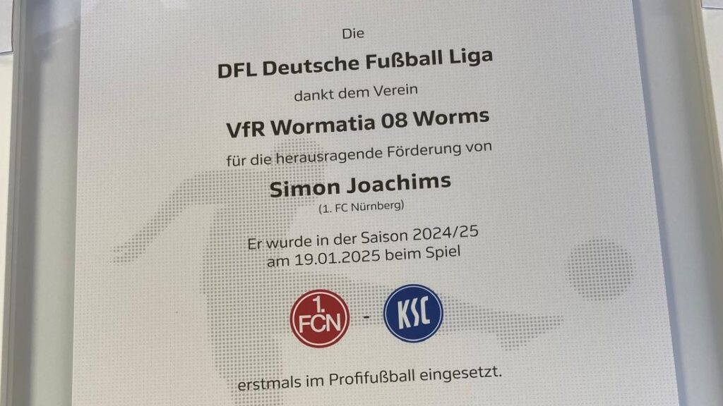 Für Simons Profidebüt hat der VfR Wormatia nun als Dank für sechs Jahre Ausbildungsleistung letzte Woche eine Urkunde der DFL erhalten, verbunden mit der sogenannten Ausbildungshonorierung. Diese wird ausgezahlt, wenn ein Spieler seinen ersten Vertrag als Lizenz- oder Vertragsspieler unterschrieben, spätestens in der Folgesaison sein Debüt in der Bundesliga oder 2. Bundesliga gegeben hat und zu Beginn dieser Saison jünger als 23 Jahre war. Dann erhalten alle Vereine, die den Spieler bis zum 21. Lebensjahr ausgebildet haben, pro Jahr einen festen Betrag. Und so durfte sich der VfR Wormatia nicht nur mit Simon Joachims über sein Debüt freuen, sondern auch über 40.592€!